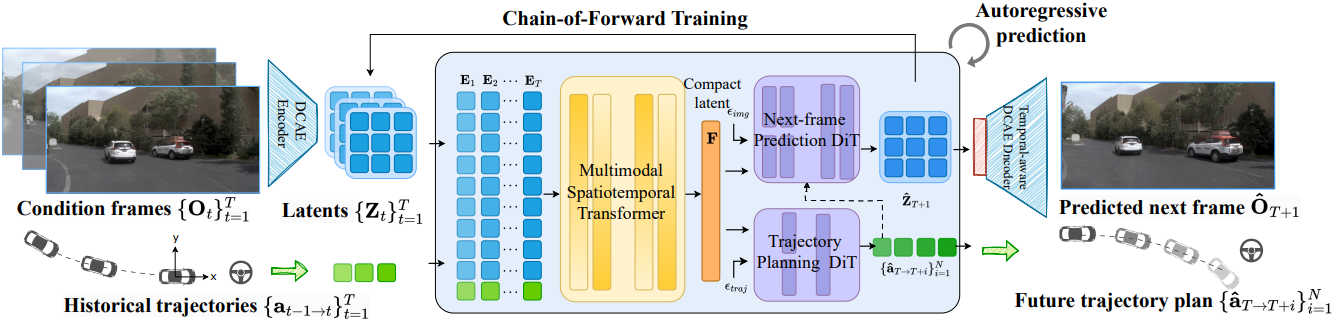 먼저, MST는 과거 컨텍스트 \(\{\textbf{O}_t, \textbf{a}_t\}_{t=1}^T\)를 간결한 latent 표현으로 인코딩하여 환경 컨텍스트와 주행 역학을 효과적으로 포착한다. 그런 다음, 과거 latent들을 기반으로 TrajDiT는 궤적 planning을 위한 policy $\pi$를 모델링하고, VisDiT는 미래 이미지 생성을 위한 시각적 분포 $p$를 모델링한다.