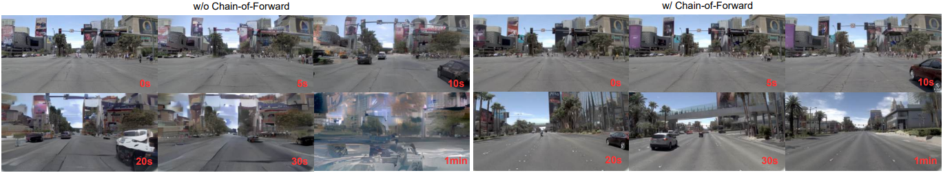 본 논문에서 제안하는 world model을 이용하면 미래 동영상을 프레임 단위로 autoregressive하게 생성할 수 있다. 그러나 긴 동영상 생성에는 드리프트 문제가 존재한다. 학습 단계에서는 모델이 GT 과거 컨텍스트를 사용하여 다음 프레임을 예측하는 반면, inference 단계에서는 자체적인 과거 예측에 의존한다. 이러한 도메인 격차는 오차 누적과 동영상 품질 저하를 초래한다.