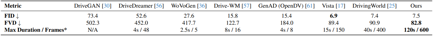 다음은 NuScenes validation set에 대하여 생성된 동영상 품질을 비교한 결과이다.