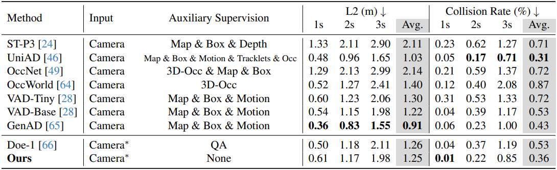 다음은 NuScenes에 대한 end-to-end motion planning 성능을 비교한 결과이다.