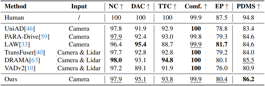 다음은 NAVSIM test set에 대한 end-to-end motion planning 성능을 비교한 결과이다.