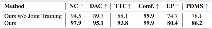 다음은 공동 학습에 대한 ablation study 결과이다. (NAVSIM test set)