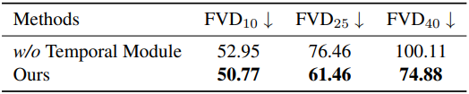 하지만 이미지 오토인코더인 DCAE는 시간적 상호작용이 부족하여 동영상 프레임을 디코딩할 때 깜빡임 현상이 발생하고, 이는 동영상 품질을 저하시킨다. 이러한 문제를 해결하기 위해, 본 논문에서는 프레임 간 일관성을 향상시키는 Temporal-aware DCAE를 제안하였다. 구체적으로, 아키텍처 변경을 최소화하면서 사전 학습된 파라미터를 최대화하기 위해, fine-tuning 과정에서 인코더는 고정된 상태로 유지하면서 DCAE 디코더 앞에 spatiotemporal self-attention layer를 도입하였다. 이를 통해 여러 프레임 간의 상호작용이 가능해지고, 생성된 동영상의 시간적 일관성이 크게 향상된다.
