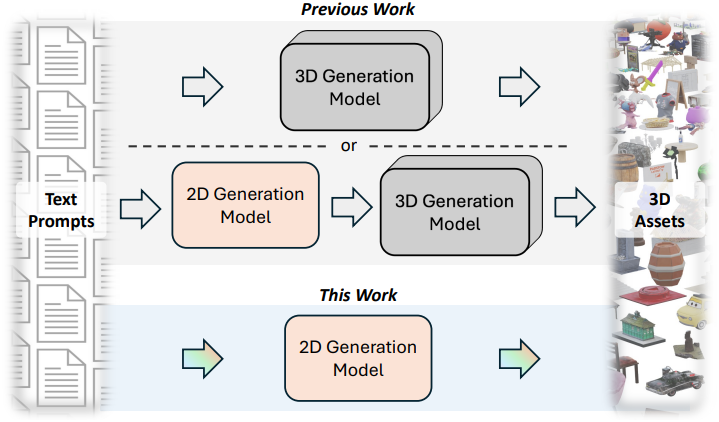 3D 생성을 위한 독립형 diffusion model 설계는 비교적 간단하다. 그러나 이러한 모델은 특히 3D 데이터만으로 학습할 경우 상당한 한계를 지니는데, 이는 고품질 3D 데이터가 2D 이미지에 비해 상대적으로 부족하기 때문이다. 3D 생성에서 더 높은 렌더링 품질을 달성하기 위해서는 잘 사전 학습된 2D diffusion model에서 얻은 prior를 활용하는 것이 바람직하다. 기존 방법들은 복잡한 설계를 통해 가중치가 고정된 사전 학습된 2D diffusion model을 3D 생성 파이프라인에 통합하였다.