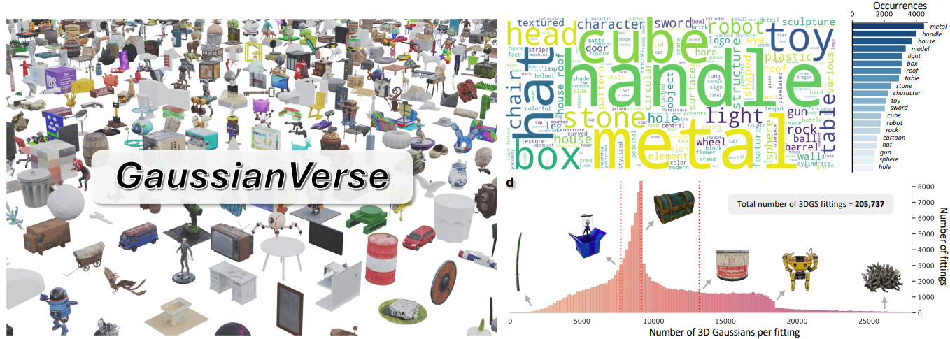본 논문에서는 다양한 object에 대한 고품질 3D Gaussian fitting으로 구성된 대규모 데이터셋인 GaussianVerse를 구축했다. 3D Gaussian 레퍼런스를 미리 계산하는 기존 연구들과 달리, GaussianVerse는 새로운 pruning 전략과 더욱 효율적이지만 계산 집약적인 fitting 프로세스를 통해 최소한의 Gaussian 개수로 더 높은 품질의 fitting 결과를 제공한다.