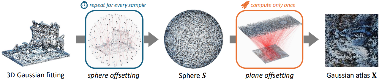 변환 과정은 세 단계로 구성된다. 첫 번째 단계에서는 3D 축의 원점을 중심으로 하고 반지름이 1인 단위 구 $\mathcal{S}$를 가정하고, 그 표면에 균일하게 분포된 $N$개의 3D 점 \(\{\textbf{s}_i \in \mathbb{R}^3\}\)으로 표현한다. 구는 2D projection에 대한 다양한 표준을 제공하는 잘 연구된 구조이므로 flattening 과정에 적합하다. 그런 다음, Optimal Transport (OT)를 사용하여 3D Gaussian들을 구 $\mathcal{S}$의 표면 점 \(\{s_i \in \mathbb{R}^3\}\)으로 이동시킨다. 이 과정을 sphere offsetting이라고 부른다.