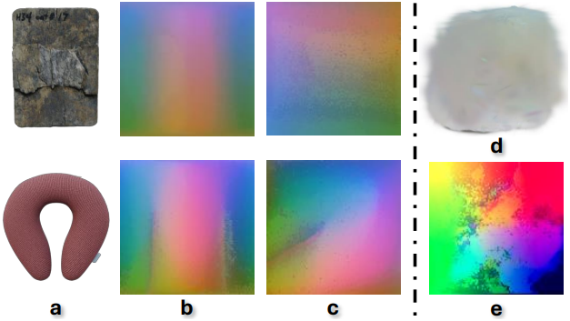 다음은 두 object(a)에 대하여 본 논문의 flattening 방식(b)과 최적화 기반 방식(c)으로 얻은 atlas (3D 위치 $\textbf{x}$)이다. (d)와 (e)는 각각 최적화 기반 방식으로 학습된 모델이 생성한 Gaussian과 atlas이다.