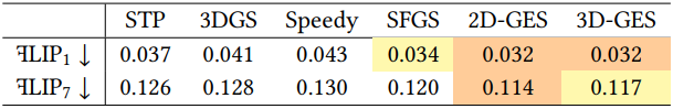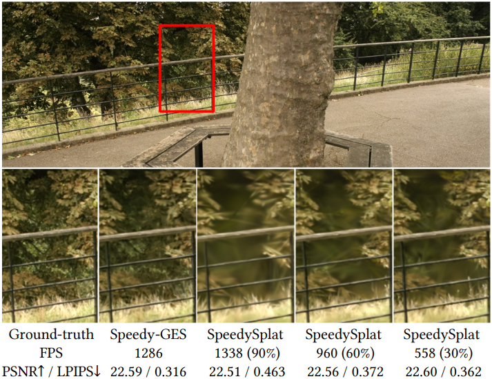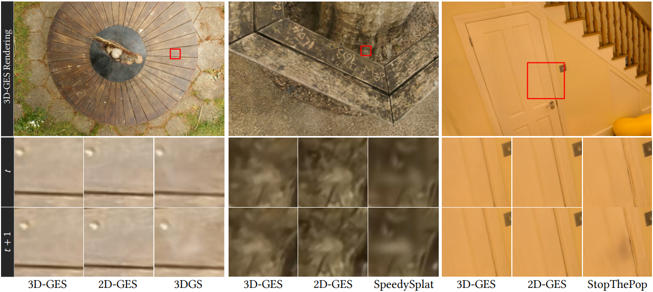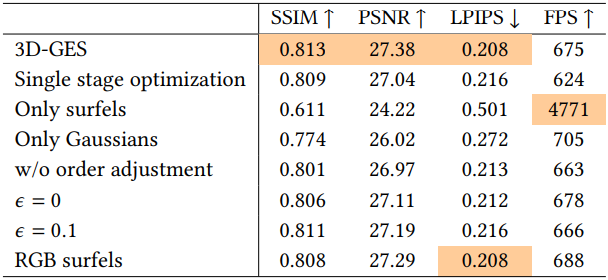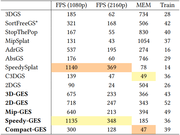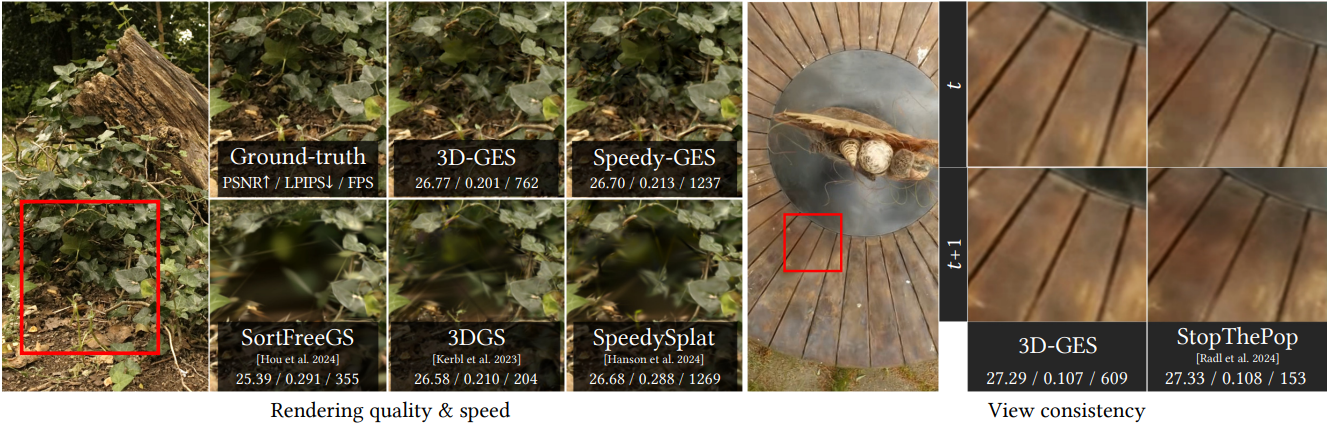 \[\begin{equation} C = \frac{C_s + C_g}{1 + W_G} \end{equation}\]3D Gaussian의 색상은 가중치에 따라 누적되고 정규화되므로 GES의 전체 렌더링 과정은 정렬이 전혀 필요하지 않다. 결과적으로 GES는 Gaussian 정렬의 계산 병목 현상을 우회하여 매우 높은 FPS를 달성할 뿐만 아니라 시점 전환 시 popping 아티팩트를 효과적으로 방지하여 시점 일관성을 유지한다.