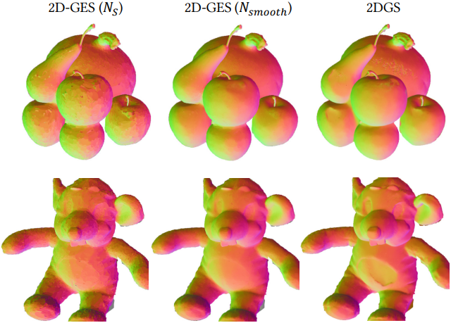 다음은 2DGS와 2D-GES의 normal map을 비교한 예시이다.