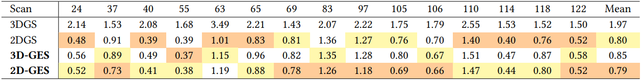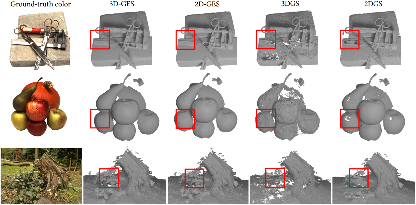 다음은 3DGS, 2DGS, 3D-GES, 2D-GES의 geometry를 비교한 결과이다.