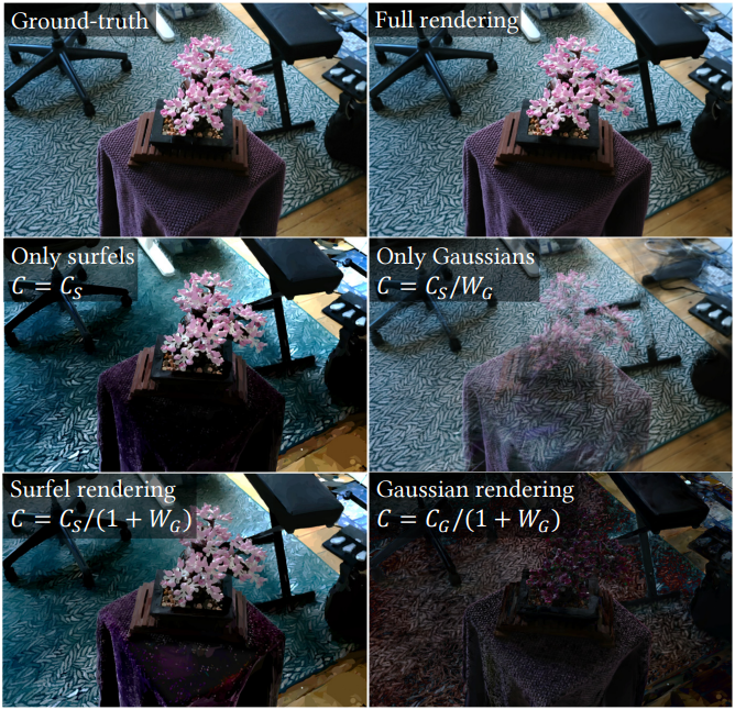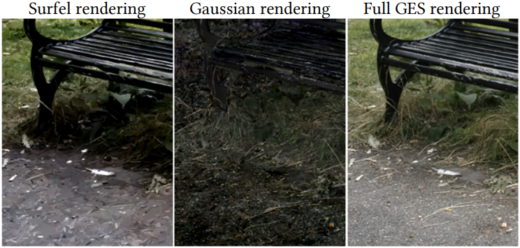 다음은 surfel만 혹은 3D Gaussian만 사용하였을 때의 렌더링 결과를 비교한 예시이다.