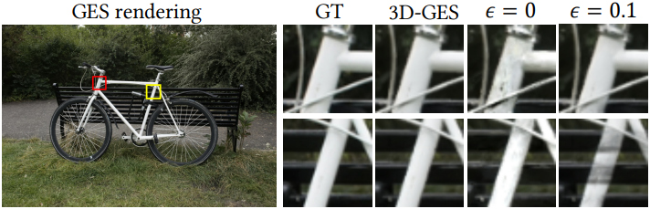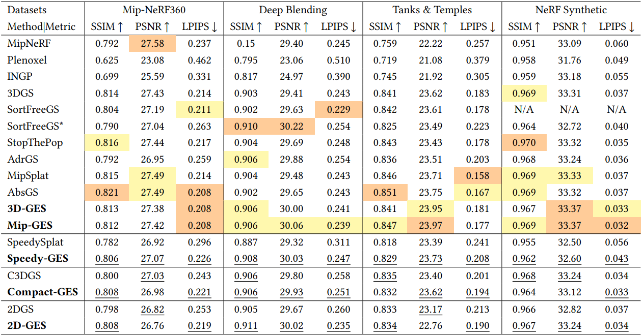 GES 표현은 기존 3DGS의 최근 개선 사항을 통합하여 렌더링 시 안티앨리어싱 (Mip-GES), 렌더링 속도 향상 (Speedy-GES), 저장 용량 축소 (Compact-GES), 더 나은 장면 geometry 재구성(2D-GES)을 달성함으로써 쉽게 확장할 수 있다.