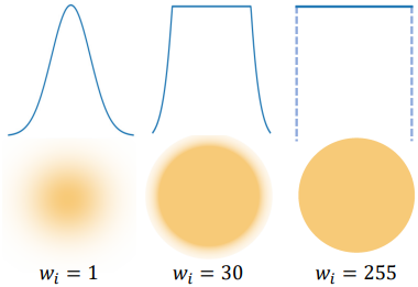 \[\begin{aligned} \alpha_i (x, y) &= \min (1, w_i G(x, y)) \\ G(x, y) &= \exp (- \frac{x^2 + y^2}{2}) \end{aligned}\]\(\alpha_i (x, y)\)는 \(\min (\alpha_i (x, y), G (x, y)) < 1/255\)일 때 0으로 고정된다. 반투명 surfel의 rasterization은 2DGS와 동일하다. $w_i = 255$일 때, $G (x, y) > 1/255$ 범위 내에서는 불투명도가 1이고, 이 범위를 벗어나면 불투명도가 0이 된다. 그 결과, 불투명도가 균일하게 1인 반지름 $r = \sqrt{2 \log (255)} \approx 3.3$인 원형 디스크가 생성된다.