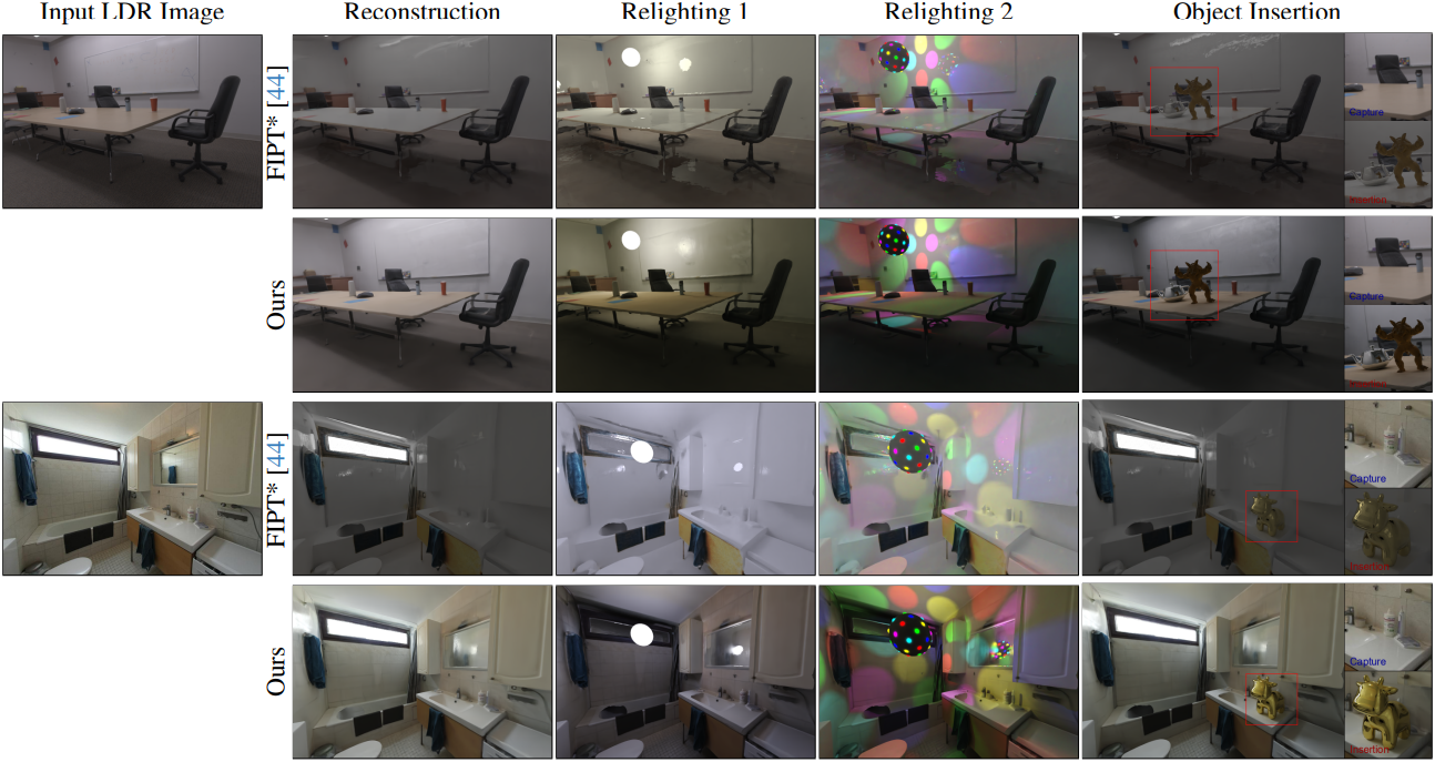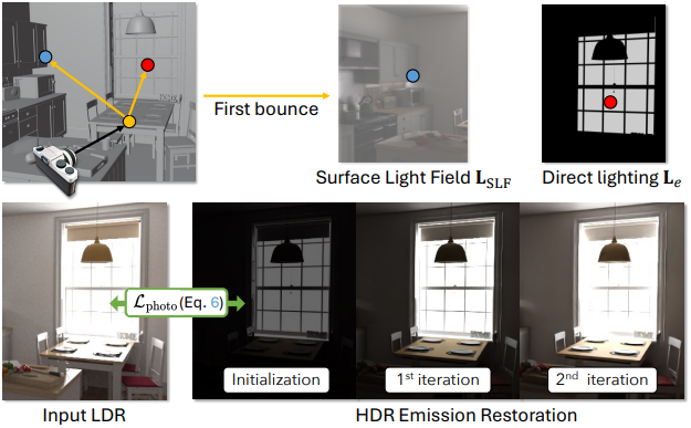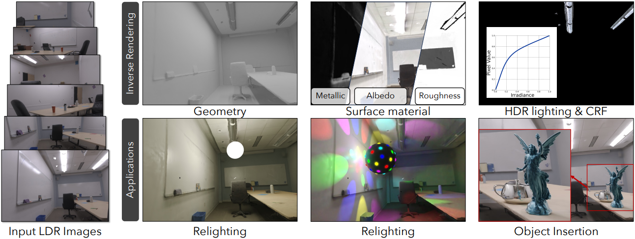 물리 기반 inverse rendering을 통해 장면에서 사실적인 material 속성과 조명(lighting)을 재구성할 수 있다. 이러한 분해는 relighting, material 편집, 사실적인 물체 삽입 등 다양한 응용 분야에 유용하다. 그러나 대부분의 기존 inverse rendering 방식은 장면의 전체 light transport를 포착하기 위해 HDR 입력 이미지를 필요로 한다.