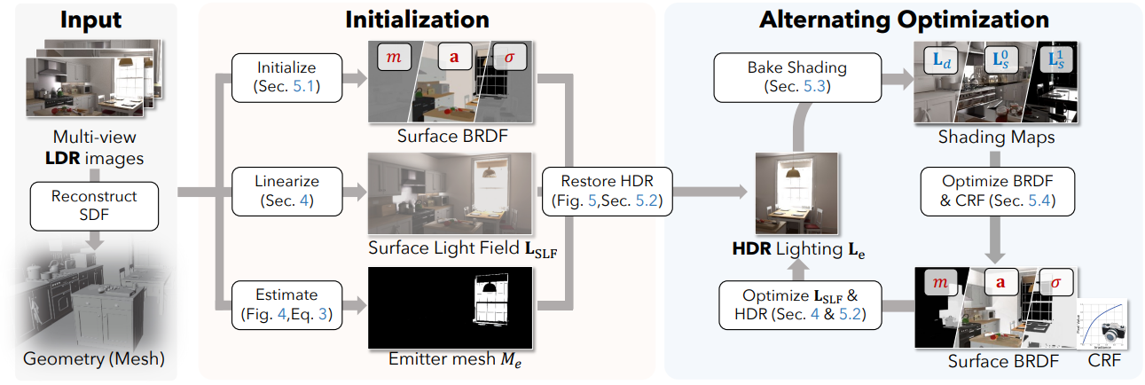 본 논문은 이러한 과제를 해결하기 위해, 멀티뷰 LDR 이미지만을 사용하는 실내 장면 inverse rendering 렌더링 방법인 IRIS를 소개한다. IRIS는 tone mapping (HDR-LDR 변환)을 모델링하여 LDR 입력을 직접 처리할 수 있도록 한다. IRIS는 물리 기반 inverse rendering을 통해 자동으로 emitter를 식별하고 HDR 조명을 재구성한다. 이는 정확한 material 추정에 필수적이다. 조명, 표면 material, camera response function(CRF)을 동시에 추정하는 것은 모호성으로 인해 최적화가 불안정해지는 결과를 초래한다. 이 문제를 해결하기 위해, 본 연구에서는 이러한 모호성을 효과적으로 해결하고 고품질 추정을 가능하게 하는 새로운 최적화 전략을 설계했다.