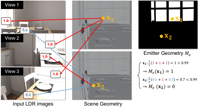 Emitter가 뷰 전체에서 밝게 나타나고 LDR 이미지에서 채도가 높은 픽셀을 생성한다는 점을 감안할 때, 표면 메쉬에서 binary emitter geometry \(M_e (\textbf{x})\)를 다음과 같이 추정한다.