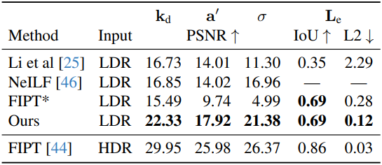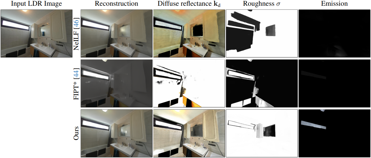 SOTA inverse rendering 방법 중 다수는 HDR 입력을 사용하여 material 속성과 조명을 정확하게 복원한다. 일부 방법은 LDR 이미지를 입력으로 사용하여 조명을 계산함으로써 이 문제를 해결하려고 시도하였다. 그러나 이러한 기법은 무한히 먼 거리의 광원, emitter mask와 같은 추가 입력, multi-bounce light transport와 같은 단순화된 가정을 하는 경우가 많다. 결과적으로 이러한 방법들은 실내 장면에서 복잡한 light transport를 처리하는 데 어려움을 겪고, 고품질 표면 material과 조명을 생성하지 못하는 경우가 많다.