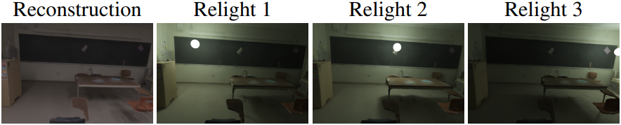 Emitter radiance \(\textbf{L}_e (\textbf{x})\)는 촬영된 이미지와 일치하도록 향상되고, BRDF와 CRF는 이 단계에서 고정된다. 직관적으로, PBR에서 \(\mathcal{L}_\textrm{photo}\)를 최소화하려면 emitter radiance \(\textbf{L}_e (\textbf{x})\)를 크게 증가시켜 렌더링된 이미지의 전반적인 밝기를 향상시켜야 한다. 따라서 이 과정에서 HDR 조명이 복원된다.
