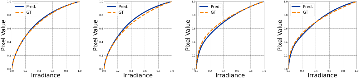 \[\begin{equation} \textrm{CRF}(x) = \textrm{LERP}(\{\textbf{g}_k\}_k, x) \end{equation}\]로 discretize되며, 이는 균일하게 샘플링된 CRF \(\{\textbf{g}_k\}_{k=0}^{1023} \in [0, 1]^{1024}\)를 색상 채널별로 linear interpolation한다. 이러한 설계를 선택한 이유는 CRF 공간의 대부분을 포괄하고, 단순성 덕분에 정규화를 쉽게 적용할 수 있기 때문이며, 이는 inverse rendering의 복잡한 최적화에 큰 이점을 제공한다.