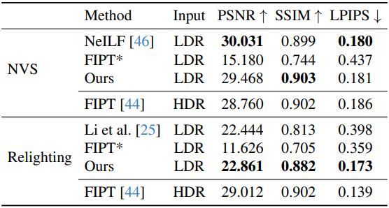 다음은 novel view synthesis (NVS)와 relighting 성능을 비교한 결과이다.