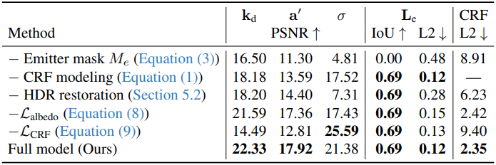 \[\begin{equation} \min_{\textbf{a}, m, \sigma, \textbf{g}} \mathcal{L}_\textrm{photo} + \lambda_a \mathcal{L}_\textrm{albedo} + \lambda_c \mathcal{L}_\textrm{CRF} + \lambda_m \mathcal{L}_\textrm{mat} \end{equation}\](\(\lambda_a = 0.01\), \(\lambda_c = 0.001\), \(\lambda_m = 0.005\))