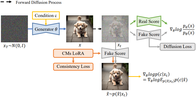 \(p (\textbf{x} \vert \textbf{x}_t)\)는 consistency model로 모델링되며, 효율성을 위해 fake score에 LoRA를 삽입하여 모델을 학습시킨다. 구체적으로, consistency model은 다음을 통해 효율적으로 학습될 수 있다.