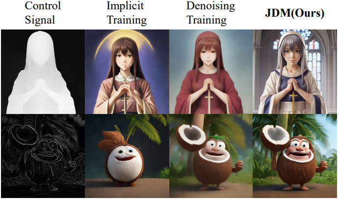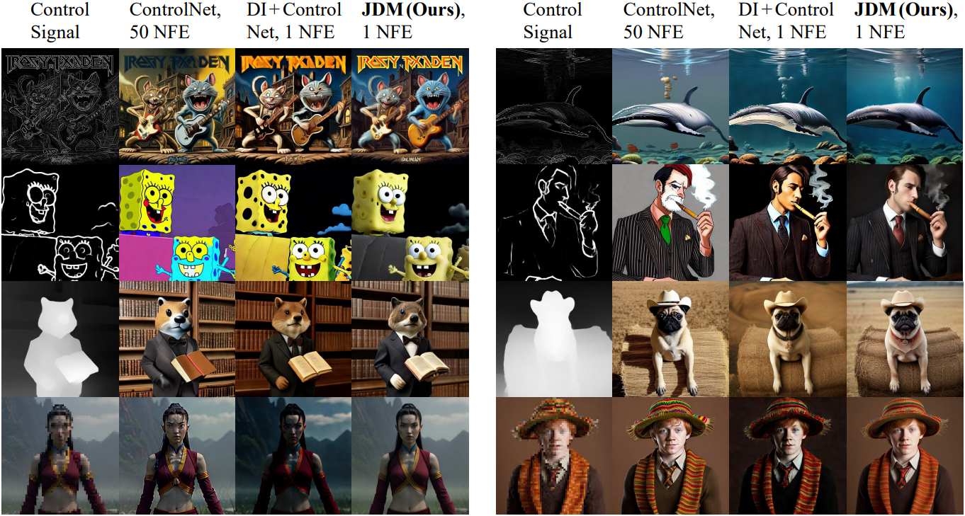 이러한 과제를 해결하기 위해, 본 논문에서는 이미지-조건 결합 분포 간의 reverse KL divergence를 최소화하는 JDM이라는 새로운 접근법을 제안하였다. 저자들은 reverse KL divergence에 대한 다루기 쉬운 상한(upper bound)을 도출하여 충실도 학습과 조건 학습을 효과적으로 분리하였다. 본 논문의 비대칭적 목적 함수는 teacher 모델은 모르는 제어를 처리할 수 있는 1-step student 모델을 얻을 수 있도록 한다.