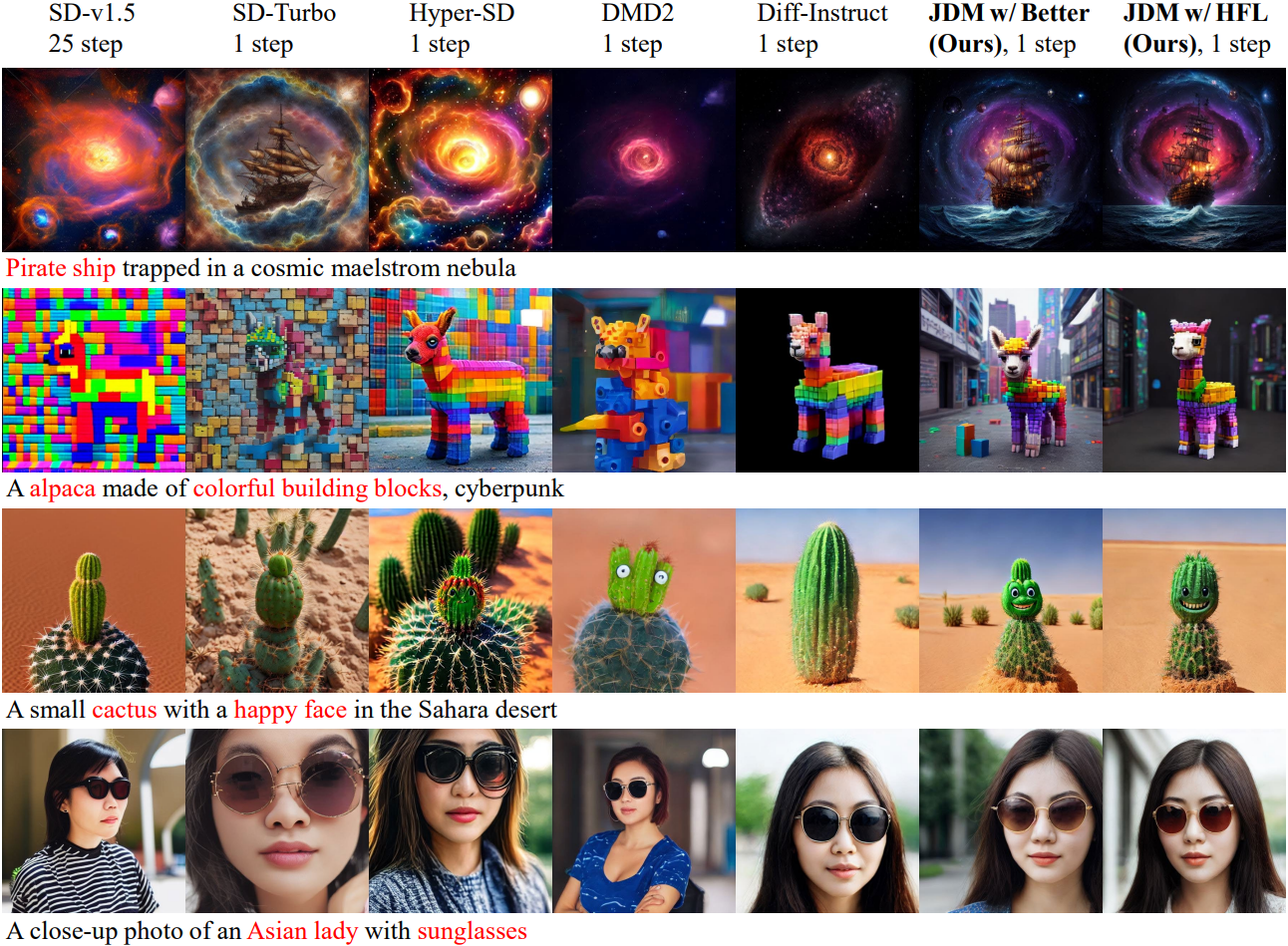 또한, 이러한 분리 메커니즘은 classifier-free guidance (CFG)의 활용도를 향상시킬 뿐만 아니라, 인간 피드백 학습(HFL)을 학습 과정에 원활하게 통합할 수 있도록 한다. 결과적으로, JDM은 생성된 이미지의 제어 가능성과 품질을 모두 향상시켜 1-step diffusion 생성을 위한 더욱 유연하고 효율적인 프레임워크를 제공한다.