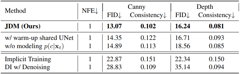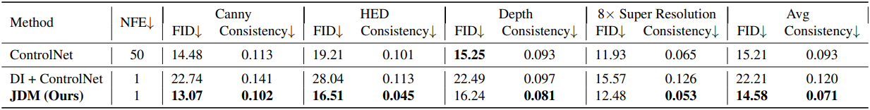 JDM은 제어 가능한 multi-step diffusion model보다 더 나은 성능을 달성하였으며 (14.58 vs 15.21), 1-step 모델 중 SOTA 성능을 확립하였다. 특히, 더 나은 CFG를 적용한 본 논문의 모델은 33.97점의 CLIP 점수를 달성하여 multi-step diffusion model의 33.03점을 크게 앞질렀다.
