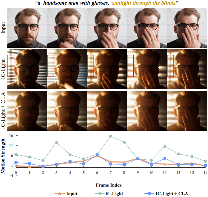 프레임별로 이미지 relighting 모델을 적용하면 생성된 광원이 동영상 프레임 간에 불안정하다. 이러한 불안정성은 외형의 relighting 불일치와 프레임 간 심한 깜빡임 현상을 초래한다. 저자들은 생성된 광원을 안정화하고 일관된 결과를 보장하기 위해 이미지 relighting 모델의 self-attention layer내에 Consistent Light Attention (CLA) 모듈을 설계했다. CLA는 시간적으로 평균화된 feature들을 attention 연산에 통합함으로써 프레임 간 상호작용을 촉진하고 구조적으로 안정적인 광원을 생성한다.