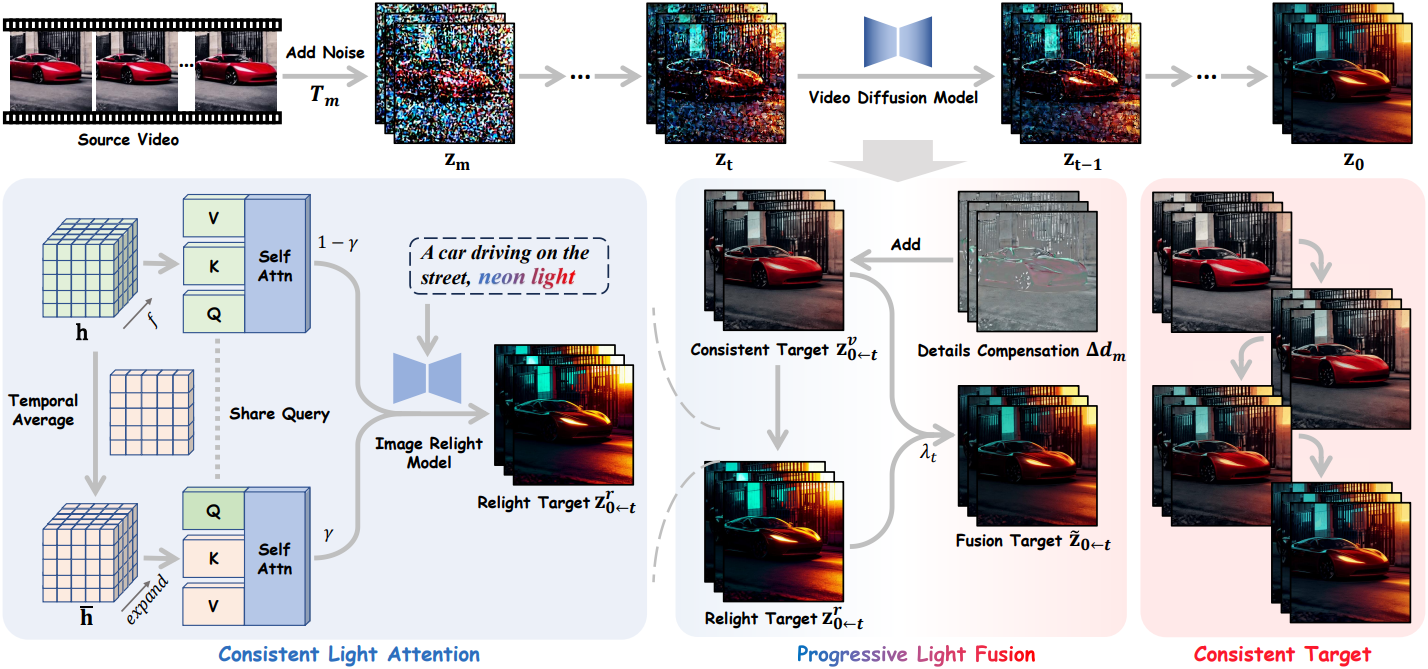 CLA 모듈은 프레임 간 일관성을 향상시키지만 픽셀 수준의 제약 조건이 부족하여 외형 디테일에 불일치가 발생한다. 이를 해결하기 위해 대규모 동영상 데이터셋으로 학습된 video diffusion model (VDM)에서 모션 prior를 활용하고, temporal attention 모듈을 사용하여 일관된 모션 및 조명 변화를 보장한다. Light-A-Video의 독창성은 denoising process에 relighting 결과를 점진적으로 적용하는 데 있다.