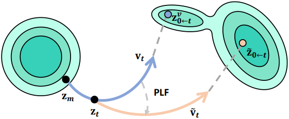 \[\begin{equation} \tilde{\textbf{v}}_t = \frac{\sqrt{\vphantom{1} \bar{\alpha}_t} \textbf{z}_t - \tilde{\textbf{z}}_{0 \leftarrow t}}{\sqrt{1 - \bar{\alpha}_t}} \end{equation}\]즉, PLF는 본질적으로 \(\textbf{v}_t\)를 반복적으로 정제하고 denoising process를 relighting 방향으로 유도한다.