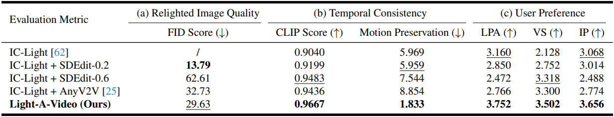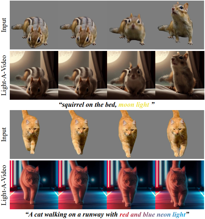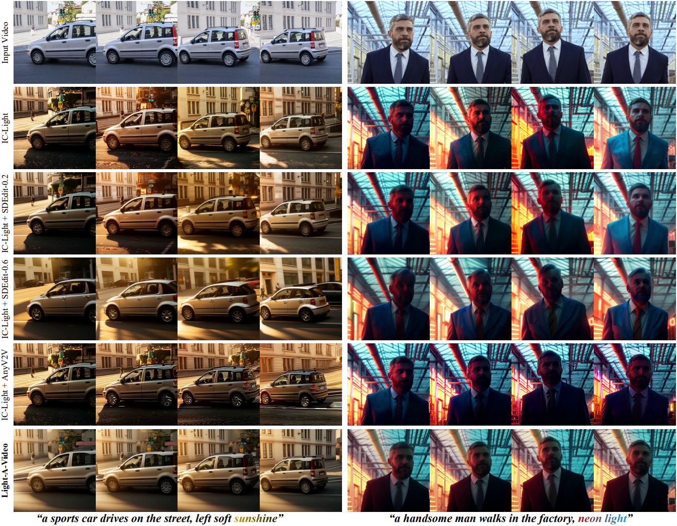 최종적으로, Light-A-Video는 완벽한 end-to-end 파이프라인으로서 부드럽고 일관된 동영상 relighting을 효과적으로 구현한다. 학습이 필요 없는 Light-A-Video는 특정 VDM에 제한되지 않으므로 다양한 인기 동영상 생성 backbone과 높은 호환성을 가진다.