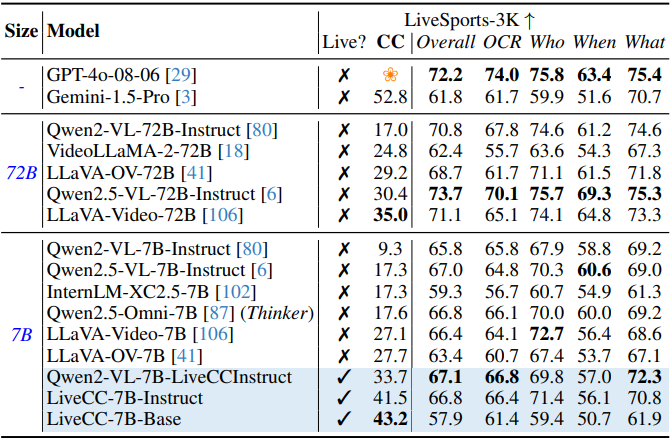 동영상-ASR 데이터를 학습을 위해, ASR 품질을 향상시키고 시각적 텍스트 정렬을 개선하는 효율적인 데이터 수집 파이프라인을 설계하였다. 이 파이프라인을 통해 Live-CC-5M 사전 학습 데이터셋과 Live-WhisperX-526K SFT 데이터셋을 구축하였다. 다음으로, 동영상-ASR 스트리밍 시퀀스를 효율적으로 모델링하기 위해, 스트리밍 사전 학습 방식을 Qwen2-VL-7B-Base 기반 모델에 통합하여 LiveCC-7B-Base를 생성하고, 정확한 ASR 단어 예측에 영향을 미치는 주요 요인들을 분석하였다. 또한, 실시간 동영상 해설을 평가하기 위해 LLM-as-a-judge 프레임워크를 활용하는 새로운 벤치마크인 LiveSports-3K를 도입하였다.