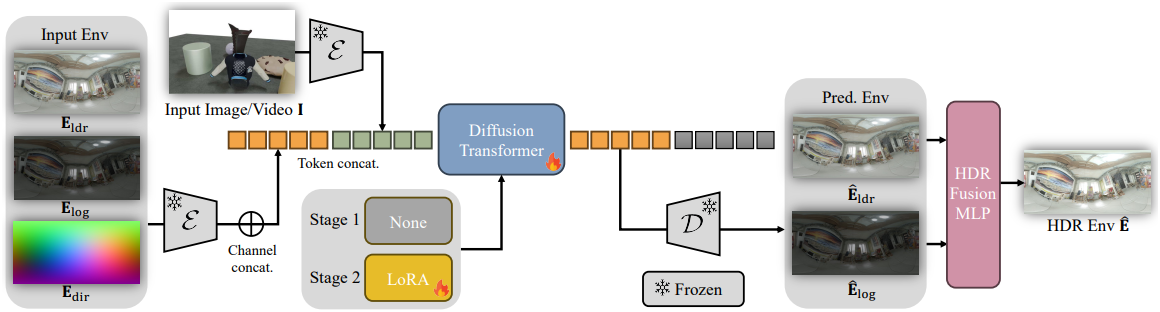 본 모델은 입력 동영상으로부터 HDR environment map을 예측하도록 변형된 diffusion model \(\mu_\theta\)를 기반으로 한다. 이 모델은 latent space에서 작동하며 HDR 조명의 두 가지 tonemapping 표현을 동시에 denoising한다.
