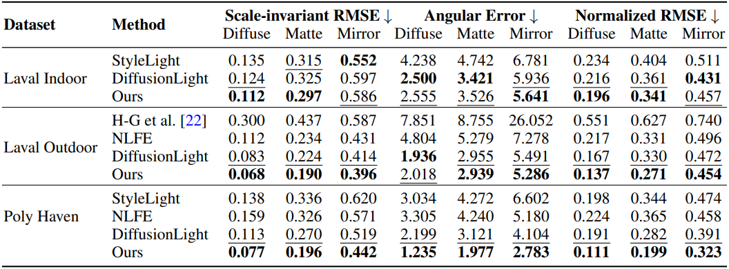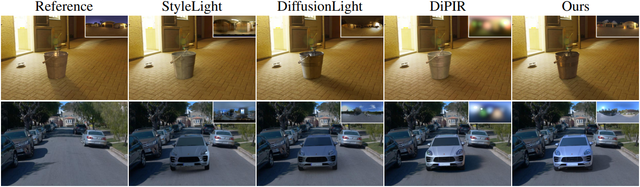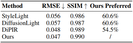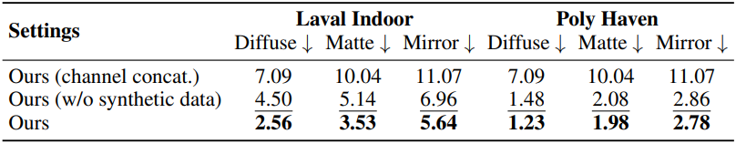 정확한 lighting 추정을 위해서는 모델이 입력에서 그림자 방향, 표면 반사, 반사광과 같은 세밀한 음영 단서를 추출해야 한다. Noise가 포함된 latent에 조건을 연결하면 성능이 저하된다. 이는 보다 유연한 컨디셔닝 메커니즘이 필요함을 시사한다.