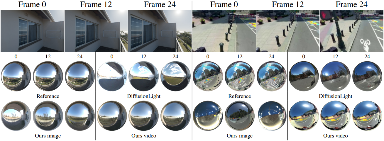 본 논문에서는 lighting 추정을 조건부 생성 task로 생각하고, 합성 데이터로 학습되어 실제 장면에도 적용 가능한 신경망 기반 lighting predictor인 LuxDiT를 제안하였다. LuxDiT는 이미지 또는 동영상을 조건으로 DiT를 fine-tuning하여 noise로부터 HDR 파노라마 이미지를 생성한다. 픽셀 단위의 task와 달리, lighting 추정은 장면 컨텍스트에 대한 글로벌한 추론을 요구한다. DiT의 attention 기반 아키텍처는 글로벌 컨텍스트 집계를 지원하며, generative prior는 음영 및 반사와 같은 간접적인 단서로부터의 추론을 용이하게 한다.