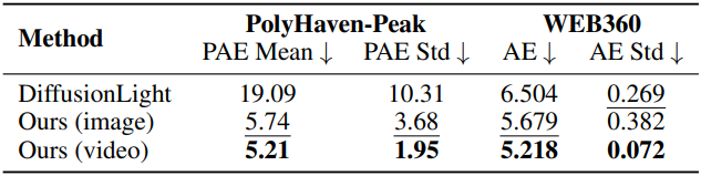 동적 파노라마 environment map 생성을 위해 LDR 파노라마 동영상에서 추출한 학습 데이터를 활용했다. 이 데이터 소스에 대한 HDR environment map 원본은 없지만, \((\textbf{I}, \textbf{E}_\textrm{ldr}, \varnothing)\) 형태로 사용했다. 여기서 \(\textbf{E}_\textrm{ldr}\)은 tonemapping을 통해 생성되었고, $\varnothing$는 log-space intensity가 없음을 나타낸다. 파노라마 동영상은 위와 동일한 절차에 따라 랜덤한 카메라 파라미터를 사용하여 동영상으로 변환된다. HDR intensity가 없음에도 불구하고, 이 데이터는 모델을 자연스러운 이미지 통계, 모션 패턴 및 다양한 실제 lighting 조건에 노출시켜 robustness와 시간적 일관성을 향상시킨다. 저자들은 WEB360 데이터셋의 2,000개의 파노라마 동영상을 학습에 사용하였으며, 그중 114개를 평가에 사용했다.