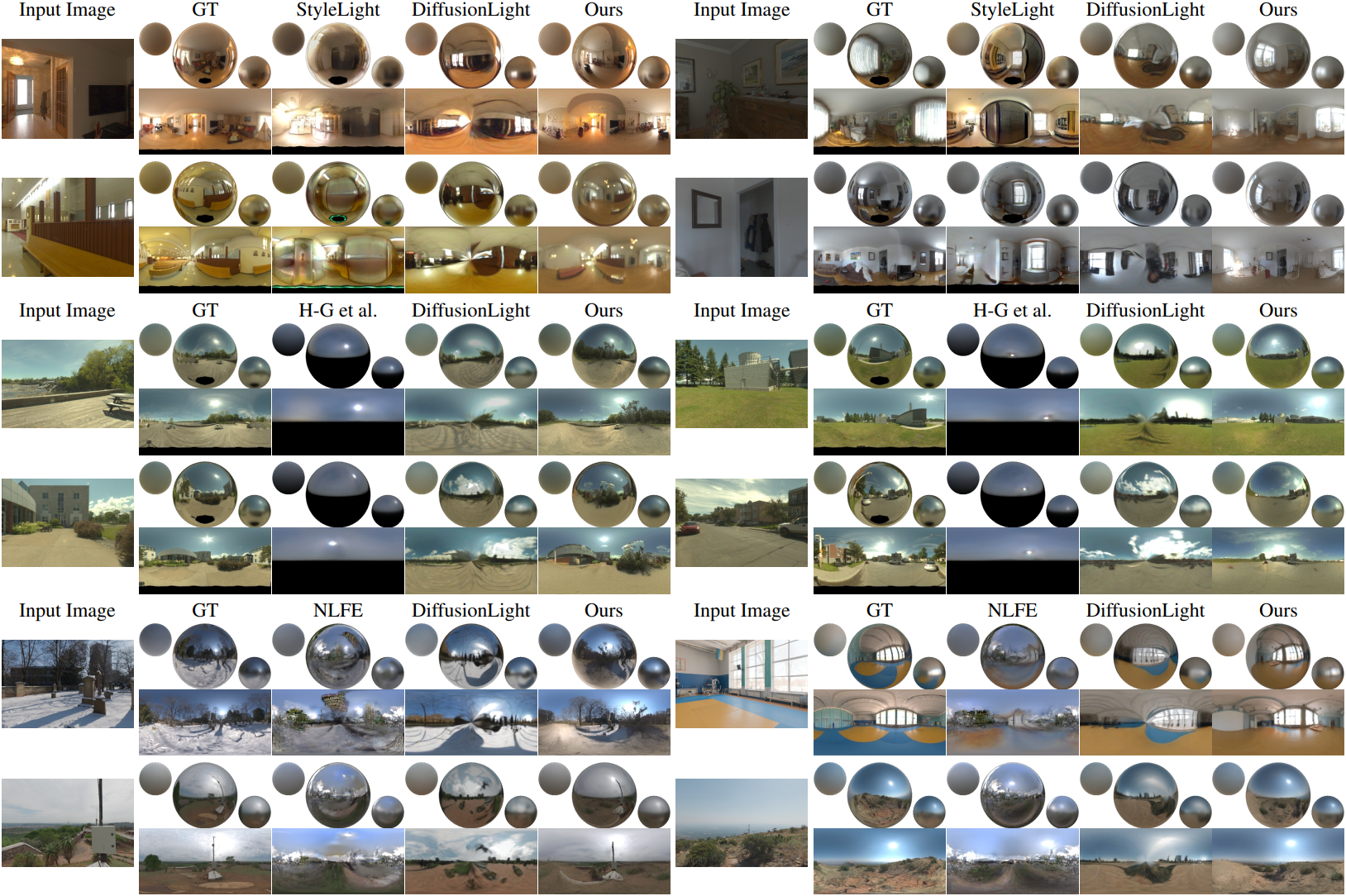 본 논문에서는 lighting 추정을 조건부 생성 task로 생각하고, 합성 데이터로 학습되어 실제 장면에도 적용 가능한 신경망 기반 lighting predictor인 LuxDiT를 제안하였다. LuxDiT는 이미지 또는 동영상을 조건으로 DiT를 fine-tuning하여 noise로부터 HDR 파노라마 이미지를 생성한다. 픽셀 단위의 task와 달리, lighting 추정은 장면 컨텍스트에 대한 글로벌한 추론을 요구한다. DiT의 attention 기반 아키텍처는 글로벌 컨텍스트 집계를 지원하며, generative prior는 음영 및 반사와 같은 간접적인 단서로부터의 추론을 용이하게 한다.