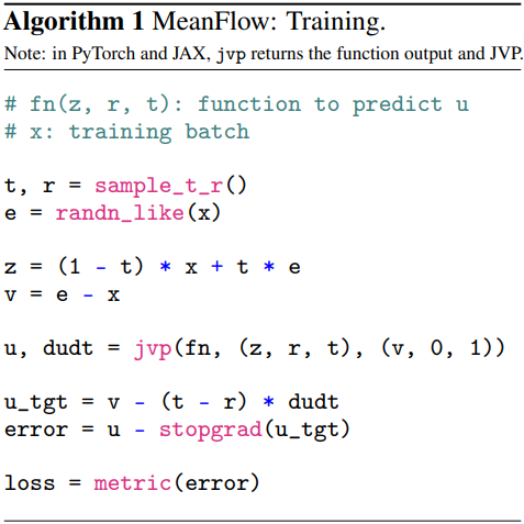 \[\begin{equation} \frac{d}{dt} u (z_t, r, t) = v (z_t, t) \partial_z u + \partial_t u \end{equation}\]이 방정식은 전미분이 함수 $u$의 Jacobian \([\partial_z u, \partial_r u, \partial_t u]\)와 접선 벡터 $[v, 0, 1]$의 Jacobian-vector product (JVP)으로 주어진다는 것을 보여준다. PyTorch의 torch.func.jvp 또는 JAX의 jax.jvp와 같은 jvp 인터페이스를 통해 이를 효율적으로 계산할 수 있다.