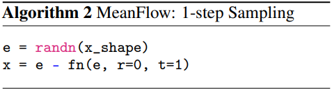 MeanFlow 모델을 사용한 샘플링은 시간 적분을 평균 속도로 대체하는 것만으로 간단하게 수행된다.