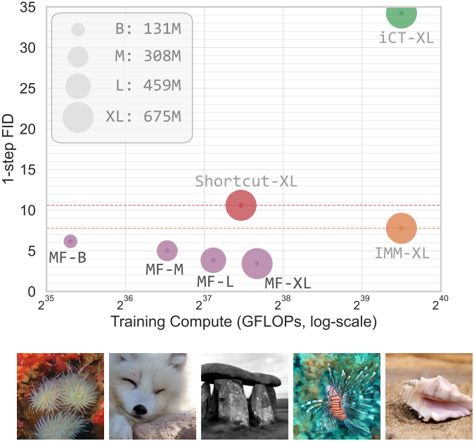 이러한 기본 개념을 바탕으로, 평균 velocity field를 직접 모델링하는 신경망을 학습시킨다. 평균 속도와 순간 속도 사이의 내재적 관계를 만족하도록 신경망을 유도하는 loss function을 도입하였다. 별도의 일관성 휴리스틱은 필요하지 않다. GT field의 존재는 최적해가 원칙적으로 특정 신경망에 독립적임을 보장하며, 이는 실제로 더욱 robust하고 안정적인 학습으로 이어질 수 있다. 또한, 본 프레임워크는 classifier-free guidance (CFG)를 GT field에 자연스럽게 통합할 수 있으며, guidance를 사용할 때 샘플링 시간에 추가 비용이 발생하지 않는다.