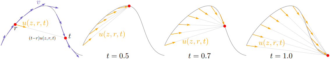 \[\begin{equation} u(z_t, r, t) = \frac{1}{t-r} \int_r^t v(z_\tau, \tau) d \tau \end{equation}\]$u(z_t, r, t)$는 $(r, t)$에 공동으로 의존하는 field이다. 일반적으로 평균 속도 $u$는 순간 속도 $v$의 함수로 표현된다. 이는 어떤 신경망에도 의존하지 않고 $v$에 의해 유도되는 field이다. 개념적으로, 순간 속도 $v$가 Flow Matching에서 GT field 역할을 하는 것처럼, 평균 속도 $u$는 학습을 위한 GT field를 제공한다.