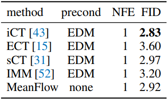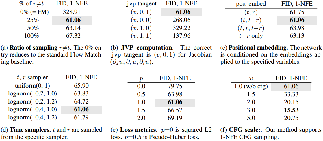 \(u_\theta^\textrm{cfg}\)는 CFG velocity $v^\textrm{cfg}$에 의해 유도된 평균 속도인 $u^\textrm{cfg}$를 직접 모델링한다. 결과적으로 샘플링 중에 선형 결합이 필요하지 않다. 따라서 \(u_\theta^\textrm{cfg}\)를 직접 사용하여 1-step 샘플링이 가능하다.
