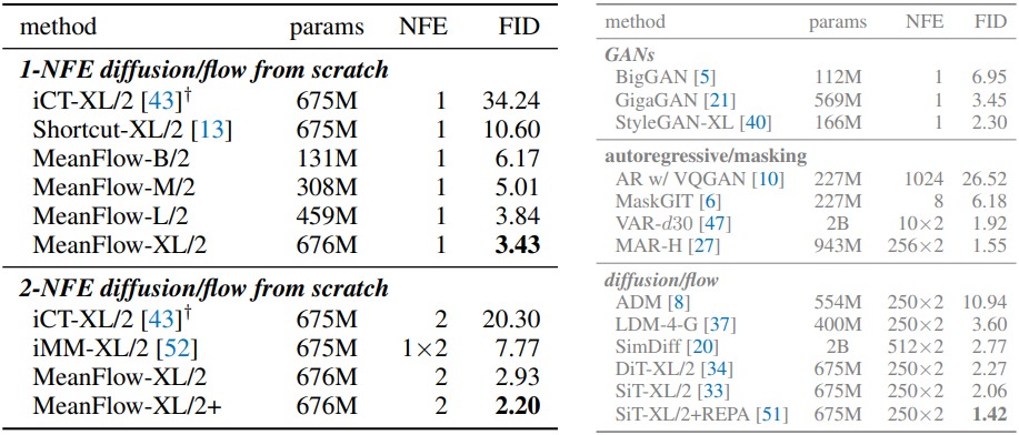 MeanFlow 모델은 ImageNet 256$\times$256 데이터셋에서, 1-NFE 생성을 통해 3.43의 FID를 달성했다. 이는 동급 SOTA 모델 대비 50%~70%의 상대적 성능 차이를 보이는 결과이다. 또한, 본 방법은 사전 학습, distillation, curriculum learning 없이 완전히 처음부터 학습된 생성 모델이다.