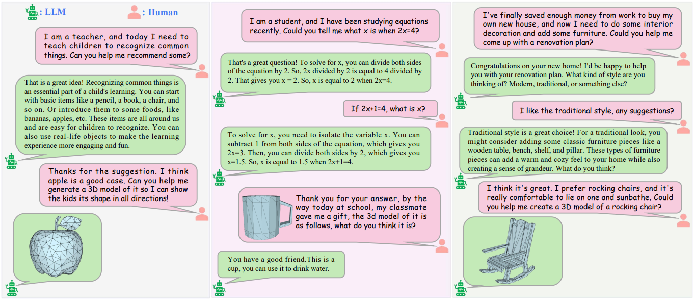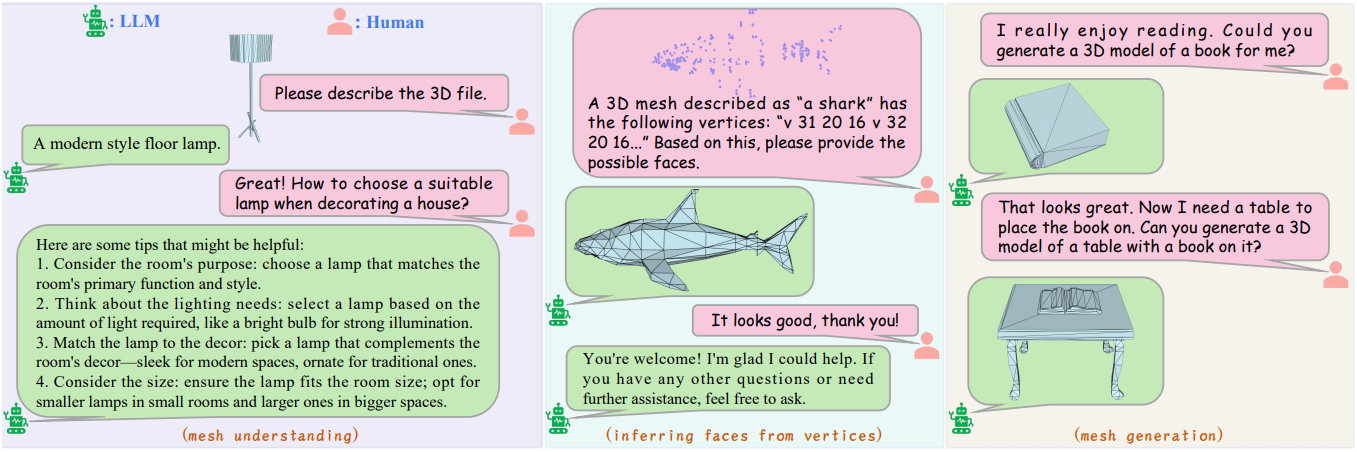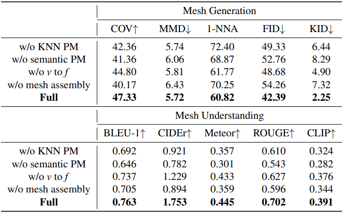 \[\begin{equation} \max_\theta P (\mathcal{T} \vert \mathcal{M}, \theta) \end{equation}\]이를 통해 LLM은 메쉬 데이터를 기반으로 정확하고 유창한 설명을 생성하여 고수준 semantic 정보를 이해할 수 있다.