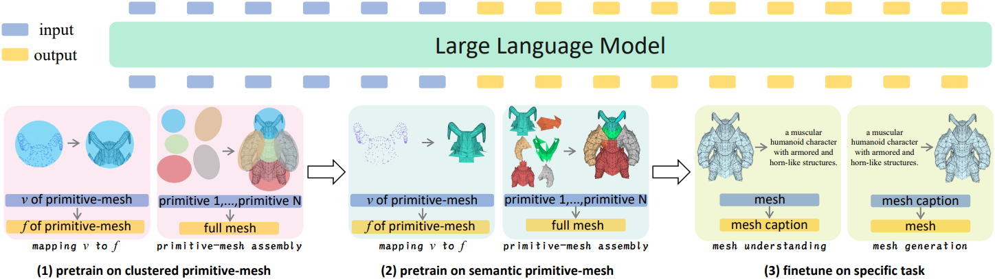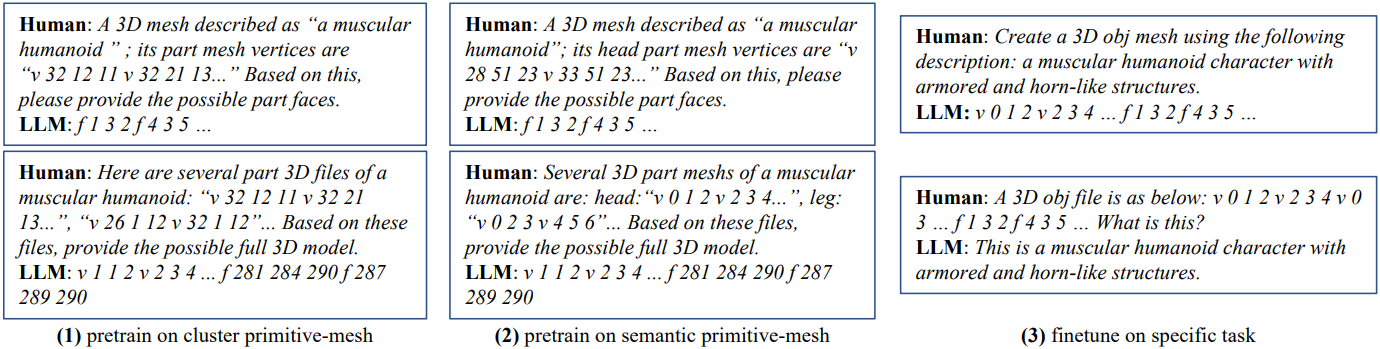 이러한 task들은 서로 독립적인 것이 아니라 점진적인 학습 과정을 통해 구현된다. 초기에는 vertex-face 예측 및 메쉬 조립 task를 통해 모델이 기본적인 메쉬 구조와 로컬 semantic에 익숙해지도록 한다. 이후에는 메쉬 이해 및 메쉬 생성 task를 통해 모델이 복잡한 3D 구조와 고수준 semantic을 더욱 정교하게 이해할 수 있도록 한다.