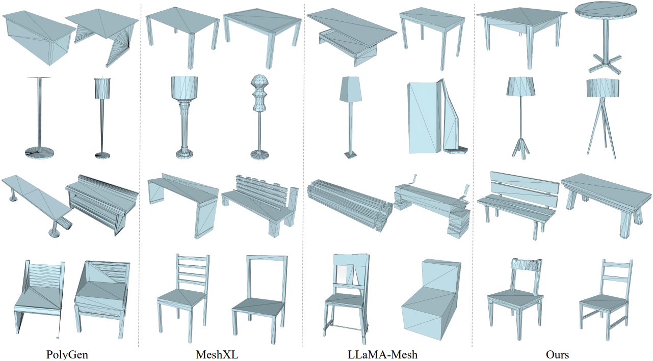 - 불충분한 3D 구조 인식: Text-serialized mesh 표현을 직접 학습하는 방식은 LLM이 3D 메쉬의 고유한 공간 구조를 간과하게 만든다.