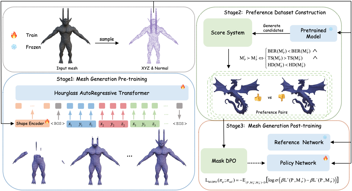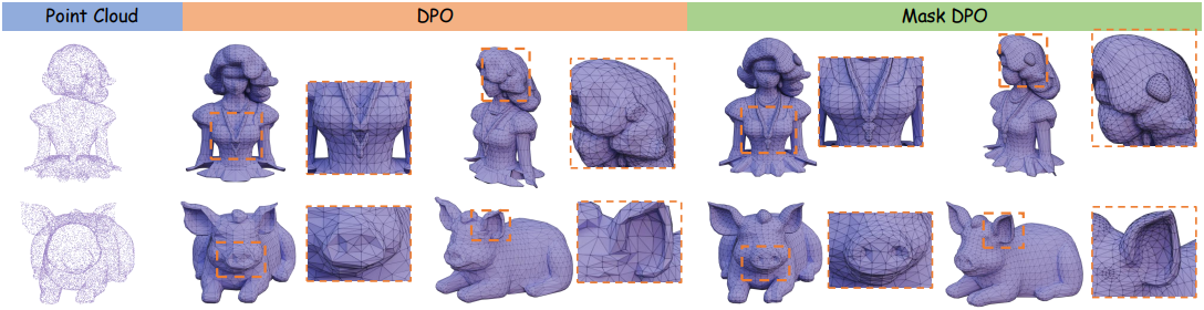 DeepMesh는 메쉬 정제를 위해 RLHF를 사용하지만, reward function이 주로 글로벌 메쉬 구조에 기반하므로 로컬 메쉬 품질에 대한 세밀한 제어에는 불충분하다. 저자들은 이러한 한계를 해결하기 위해 공간 인식 기능을 갖춘 DPO의 확장 버전인 Masked Direct Preference Optimization (M-DPO)를 제안하였다. M-DPO는 로컬한 품질 마스크를 도입하여 문제 영역에 대한 학습을 유도함으로써 보다 효과적이고 정밀한 메쉬 정제를 가능하게 한다.