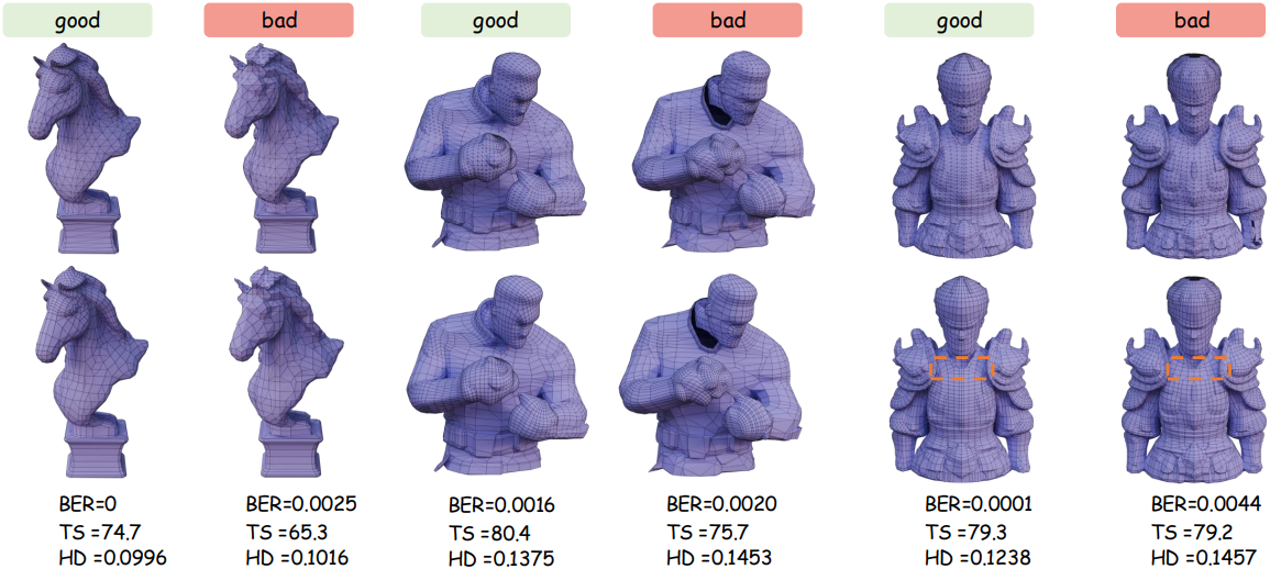 \[\begin{equation} \textrm{BER}(\mathcal{M}) = \frac{E_{\partial \mathcal{M}}}{E_{\mathcal{M}}} \end{equation}\]Topology Score (TS)는 표준 triangle-to-quad merging을 통해 얻은 사각형 메쉬 $\mathcal{Q}(\mathcal{M})$을 분석하여 메쉬 $\mathcal{M}$의 구조적 품질을 평가한다.